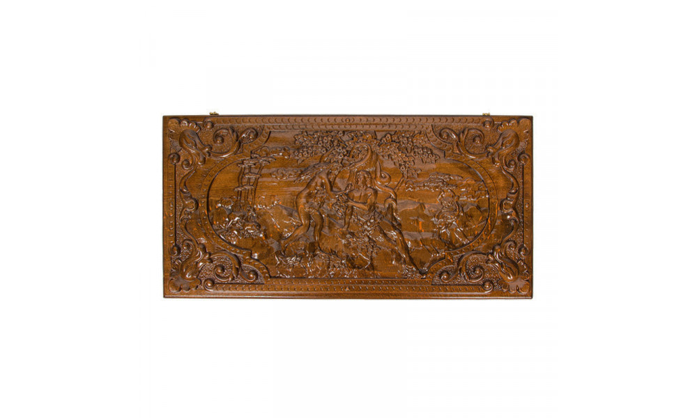 На передней створке вырезано изображение Евы, которая предлагает запретный плод Адаму. Можно сказать, что данная доска и является этим «плодом», ведь купив ее, вы не сможете оторвать глаза и на какой-то период отрешитесь от мира. На задней стороне предусмотрено шашковое поле. Все необходимое для начала партии – фишки и кости, уже лежат внутри. Вдобавок предусмотрен защитный чехол для длительного хранения и перевозки.